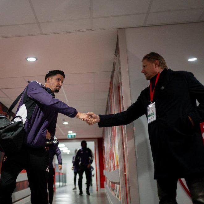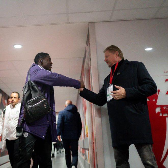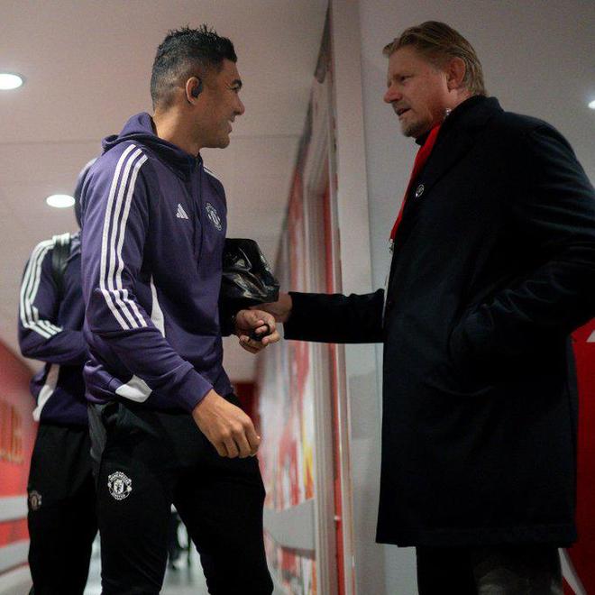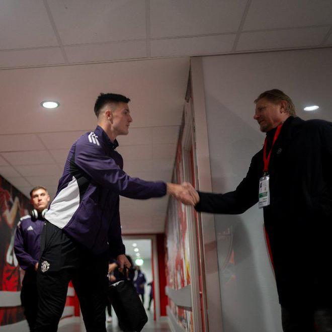 曼联传奇门将舒梅切尔也来到了现场督战比赛,赛前舒梅切尔来到球场通道处和曼联众将打招呼。